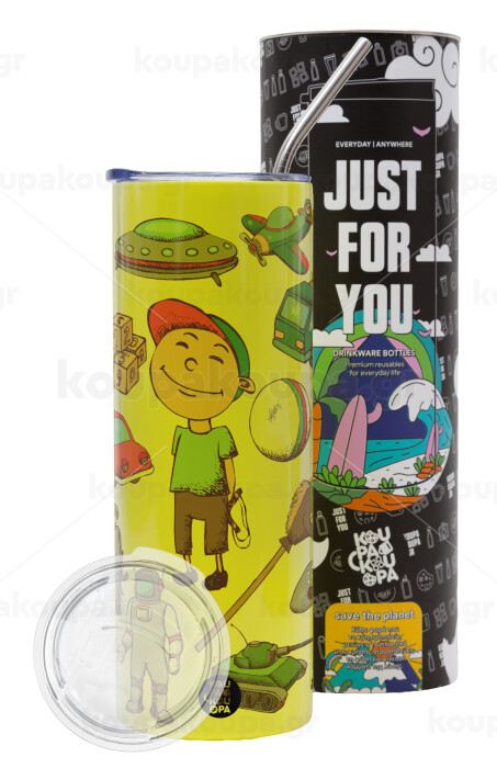 Toys Boy, Neon Yellow Travel Tumbler, with metal straw (Stainless steel 304 Food grade, BPA free, 600ml)