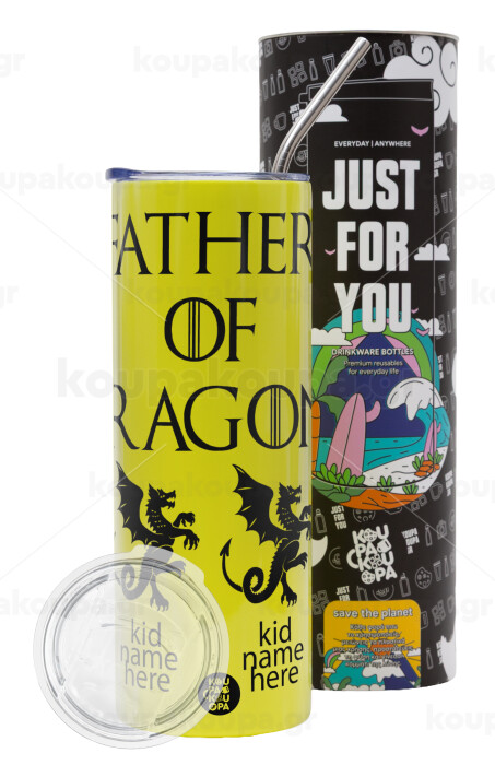 GOT, Father of Dragons (με ονόματα παιδικά), Neon Yellow Travel Tumbler, with metal straw (Stainless steel 304 Food grade, BPA free, 600ml)