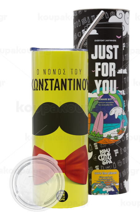 Ο νονός μου, μουστάκι με παπιγιόν, Neon Yellow Travel Tumbler, with metal straw (Stainless steel 304 Food grade, BPA free, 600ml)
