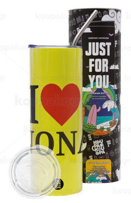 I Love ΝΟΝΑ, Neon Yellow Travel Tumbler, with metal straw (Stainless steel 304 Food grade, BPA free, 600ml)