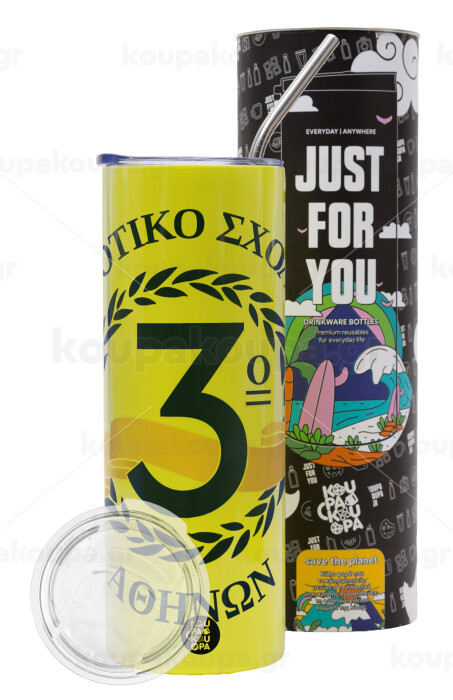 Έμβλημα Σχολικό μπλε, Neon Yellow Travel Tumbler, with metal straw (Stainless steel 304 Food grade, BPA free, 600ml)