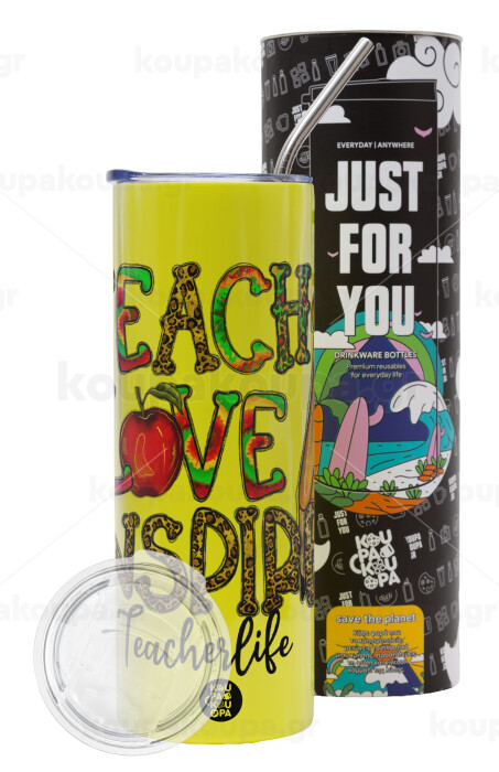 Teach, Love, Inspire, Neon Yellow Travel Tumbler, with metal straw (Stainless steel 304 Food grade, BPA free, 600ml)