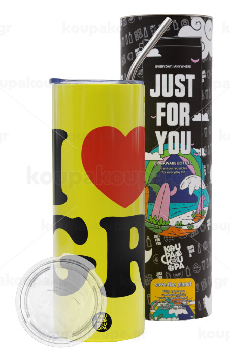 I Love GR, Neon Yellow Travel Tumbler, with metal straw (Stainless steel 304 Food grade, BPA free, 600ml)