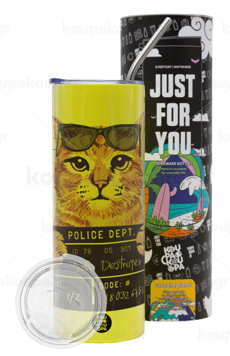 Cool cat, Neon Yellow Travel Tumbler, with metal straw (Stainless steel 304 Food grade, BPA free, 600ml)