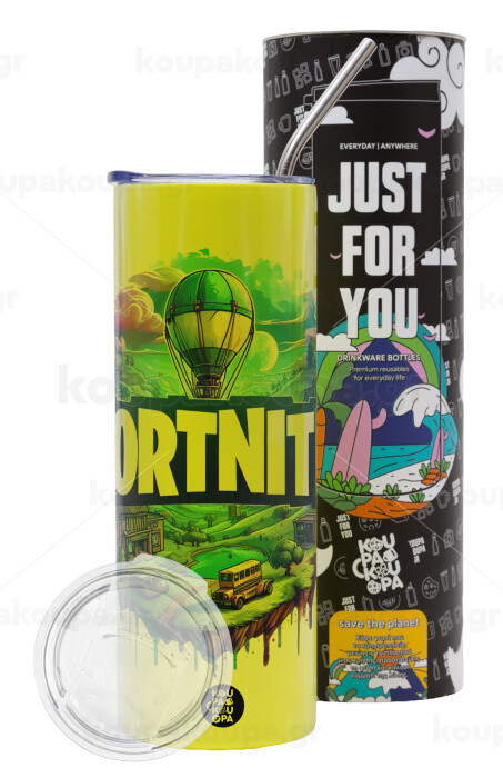 Fortnite land, Neon Yellow Travel Tumbler, with metal straw (Stainless steel 304 Food grade, BPA free, 600ml)