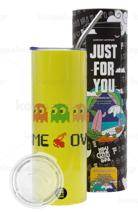 GAME OVER pac-man, Neon Yellow Travel Tumbler, with metal straw (Stainless steel 304 Food grade, BPA free, 600ml)