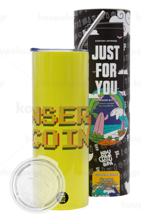 Insert coin!!!, Neon Yellow Travel Tumbler, with metal straw (Stainless steel 304 Food grade, BPA free, 600ml)