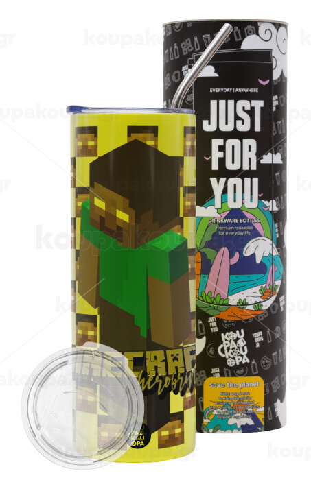 Minecraft herobrine, Neon Yellow Travel Tumbler, with metal straw (Stainless steel 304 Food grade, BPA free, 600ml)