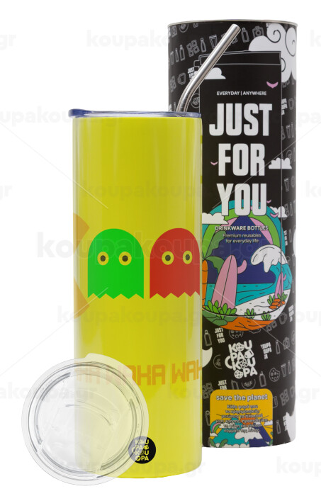Pacman waka waka waka, Neon Yellow Travel Tumbler, with metal straw (Stainless steel 304 Food grade, BPA free, 600ml)