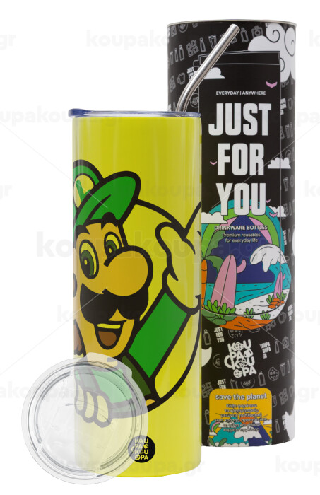 Super mario Luigi win, Neon Yellow Travel Tumbler, with metal straw (Stainless steel 304 Food grade, BPA free, 600ml)