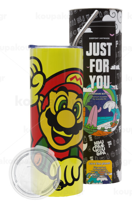 Super mario win, Neon Yellow Travel Tumbler, with metal straw (Stainless steel 304 Food grade, BPA free, 600ml)