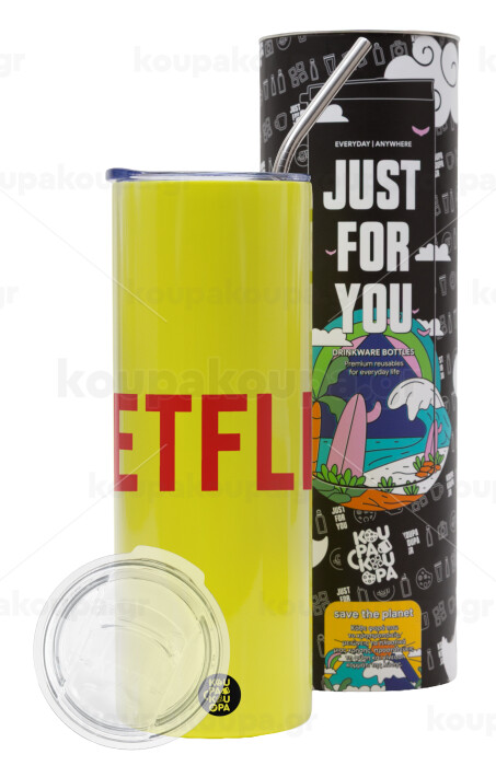 Netflix, Neon Yellow Travel Tumbler, with metal straw (Stainless steel 304 Food grade, BPA free, 600ml)