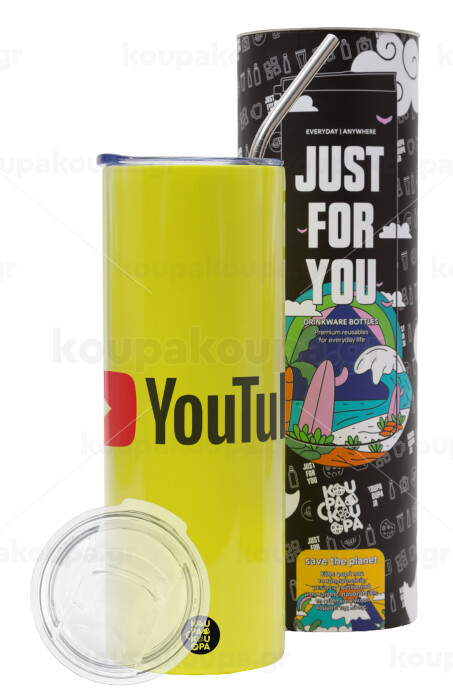 Youtube, Neon Yellow Travel Tumbler, with metal straw (Stainless steel 304 Food grade, BPA free, 600ml)