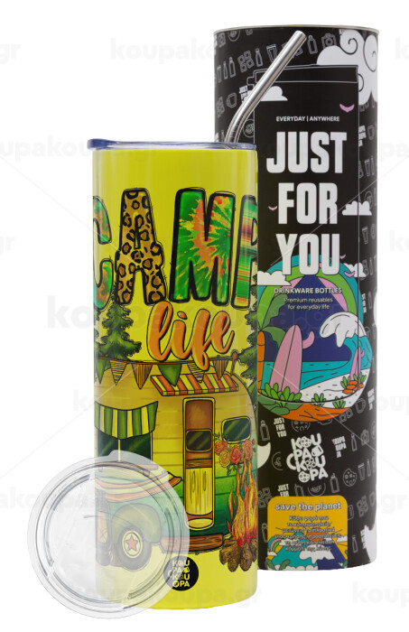 Camp Life, Neon Yellow Travel Tumbler, with metal straw (Stainless steel 304 Food grade, BPA free, 600ml)