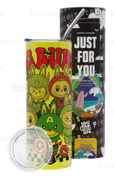 Labubu superheroes, Neon Yellow Travel Tumbler, with metal straw (Stainless steel 304 Food grade, BPA free, 600ml)