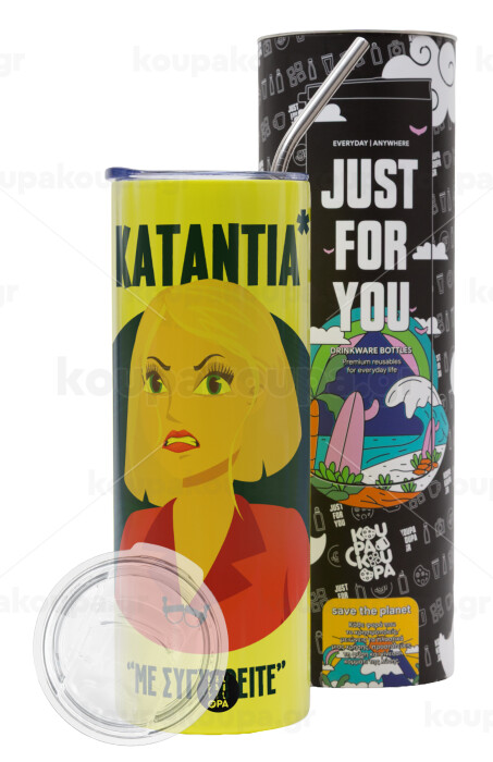 Κατάντια, με συγχωρείτε, Neon Yellow Travel Tumbler, with metal straw (Stainless steel 304 Food grade, BPA free, 600ml)