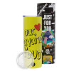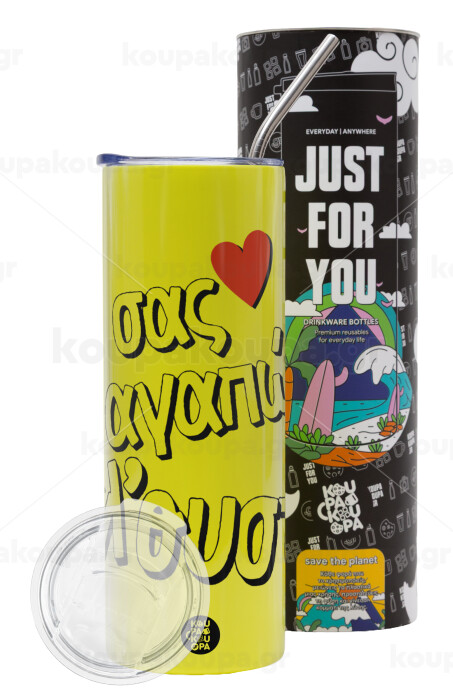 Σας αγαπώ όλ'ουστ!, Neon Yellow Travel Tumbler, with metal straw (Stainless steel 304 Food grade, BPA free, 600ml)