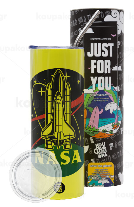 NASA Badge, Neon Yellow Travel Tumbler, with metal straw (Stainless steel 304 Food grade, BPA free, 600ml)