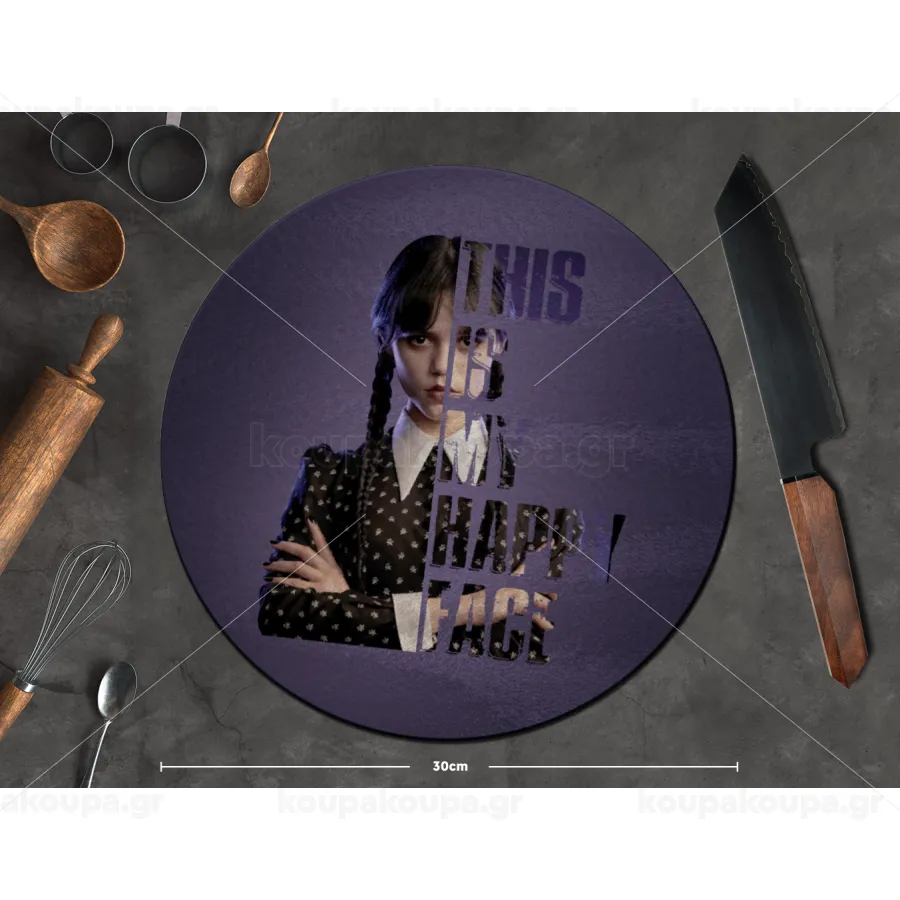 Wednesday, This is my happy face, Επιφάνεια κοπής γυάλινη στρογγυλή (30cm)