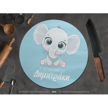 Η νονά μου, ελεφαντάκι γαλάζιο, Επιφάνεια κοπής γυάλινη στρογγυλή (30cm)