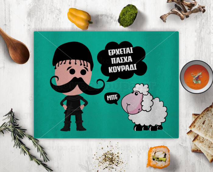 Κρητικός "Έρχεται Πάσχα κουράδι", Επιφάνεια κοπής γυάλινη (38x28cm)