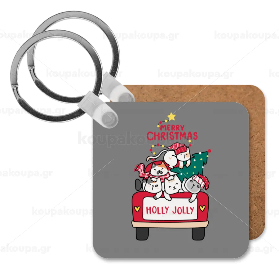 Merry Christmas cats in car, Μπρελόκ Ξύλινο τετράγωνο MDF