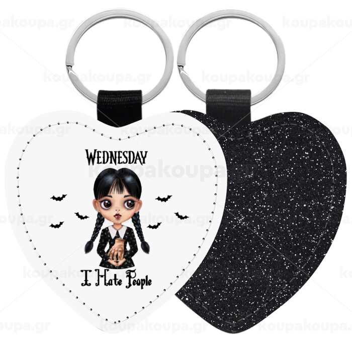 Wednesday Adams, i hate people, Μπρελόκ PU δερμάτινο glitter καρδιά ΜΑΥΡΟ