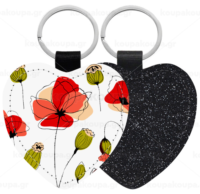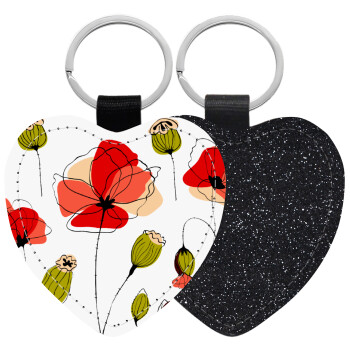 Red poppy flowers papaver, Μπρελόκ PU δερμάτινο glitter καρδιά ΜΑΥΡΟ