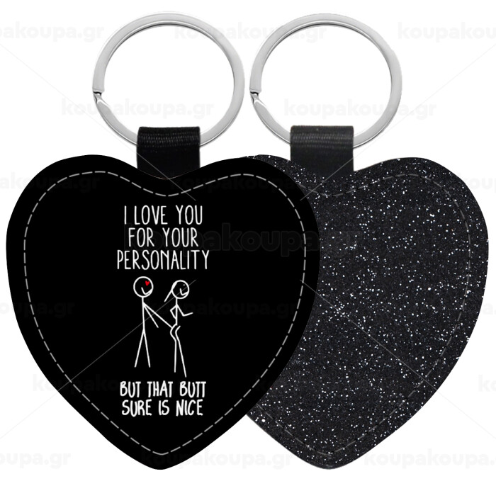 I Love you for your personality, Μπρελόκ PU δερμάτινο glitter καρδιά ΜΑΥΡΟ