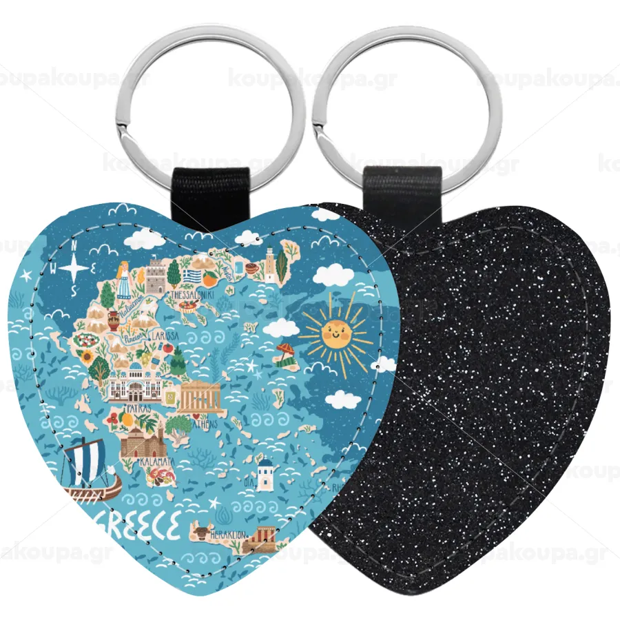 Greek map, Μπρελόκ PU δερμάτινο glitter καρδιά ΜΑΥΡΟ