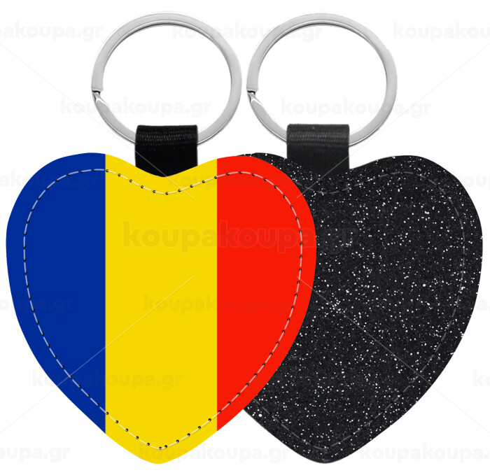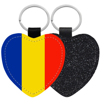 Romania flag, Μπρελόκ PU δερμάτινο glitter καρδιά ΜΑΥΡΟ