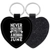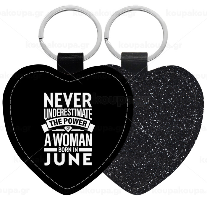 Never Underestimate the poer of a Woman born in..., Μπρελόκ PU δερμάτινο glitter καρδιά ΜΑΥΡΟ