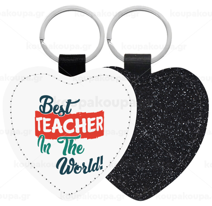 Best teacher in the World!, Μπρελόκ PU δερμάτινο glitter καρδιά ΜΑΥΡΟ