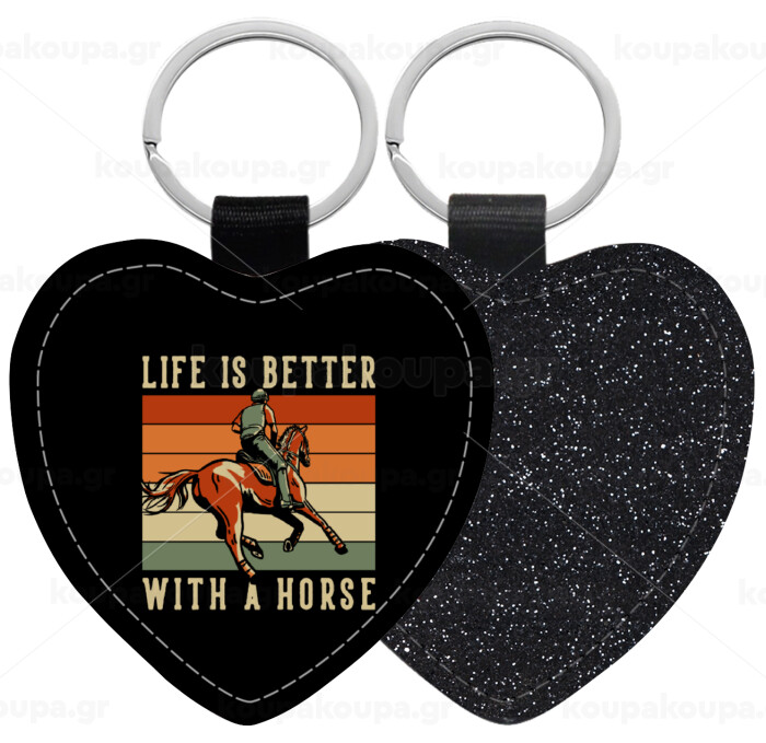 Life is Better with a Horse, Μπρελόκ PU δερμάτινο glitter καρδιά ΜΑΥΡΟ