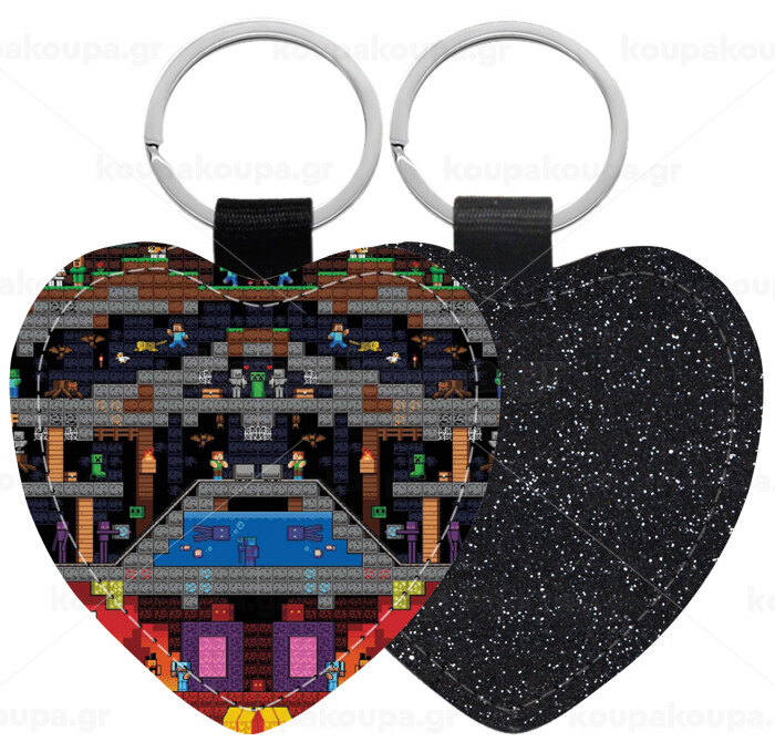 Minecraft 2D map, Μπρελόκ PU δερμάτινο glitter καρδιά ΜΑΥΡΟ