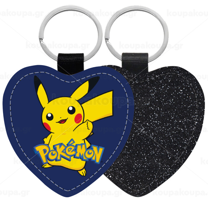 Pokemon pikachu, Μπρελόκ PU δερμάτινο glitter καρδιά ΜΑΥΡΟ