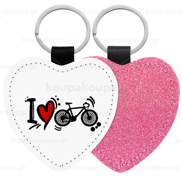 I love my bike, Μπρελόκ PU δερμάτινο glitter καρδιά ΡΟΖ