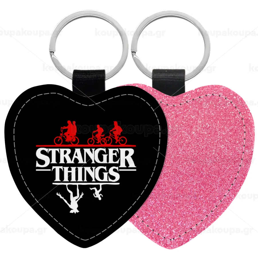 Stranger Things upside down, Μπρελόκ PU δερμάτινο glitter καρδιά ΡΟΖ