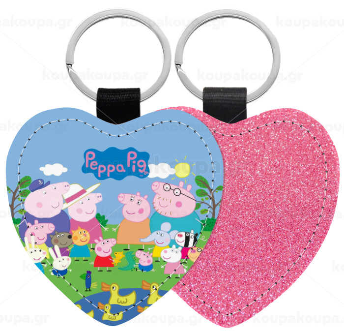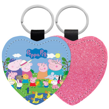 Peppa pig Family, Μπρελόκ PU δερμάτινο glitter καρδιά ΡΟΖ