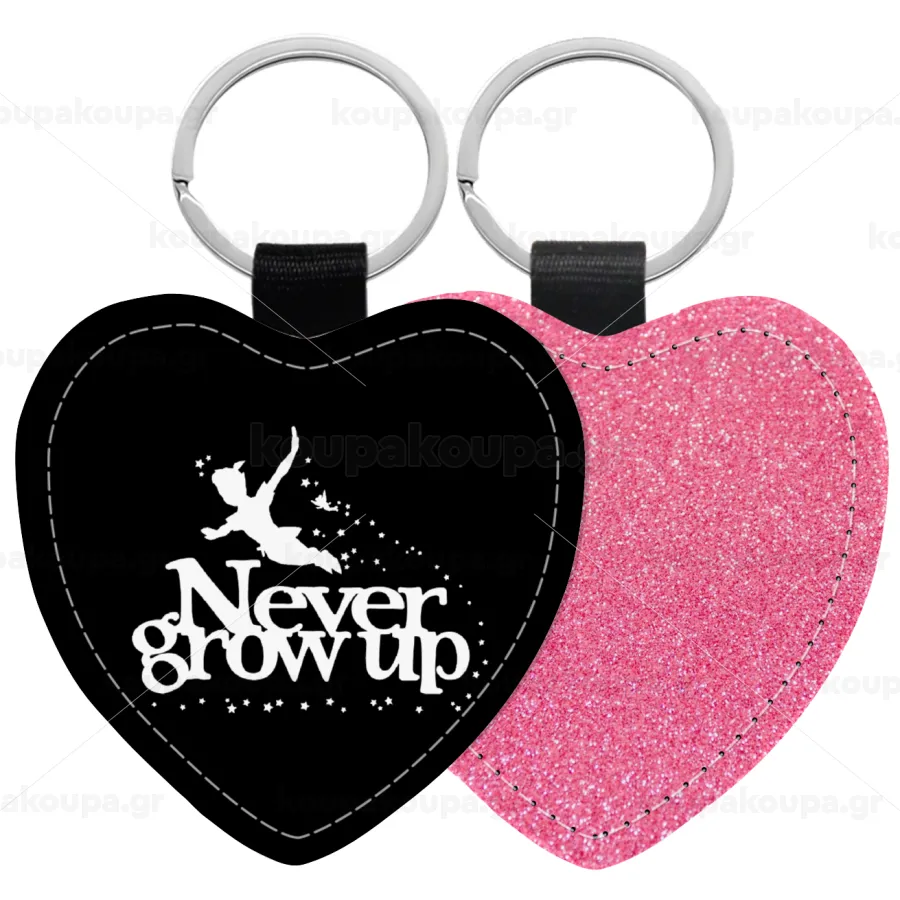 Peter pan, Never Grow UP, Μπρελόκ PU δερμάτινο glitter καρδιά ΡΟΖ