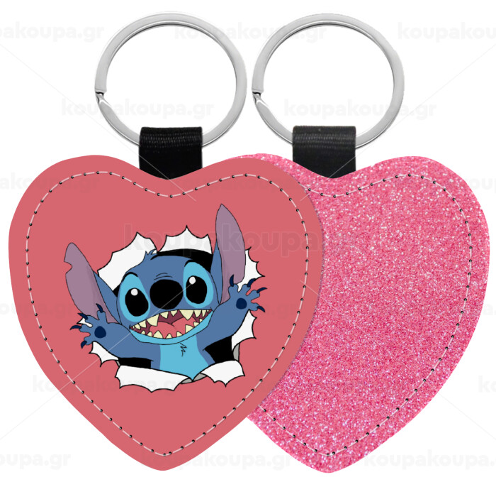 Stitch hello!!!, Μπρελόκ PU δερμάτινο glitter καρδιά ΡΟΖ