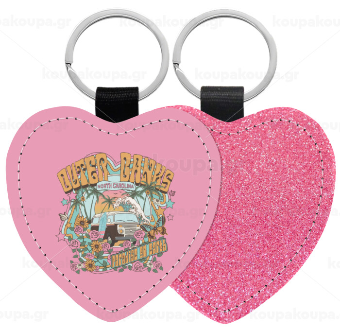 Outerbanks paradise on earth, Μπρελόκ PU δερμάτινο glitter καρδιά ΡΟΖ