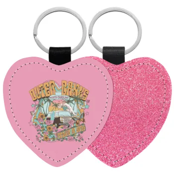 Outerbanks paradise on earth, Μπρελόκ PU δερμάτινο glitter καρδιά ΡΟΖ