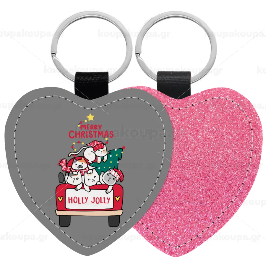 Merry Christmas cats in car, Μπρελόκ PU δερμάτινο glitter καρδιά ΡΟΖ