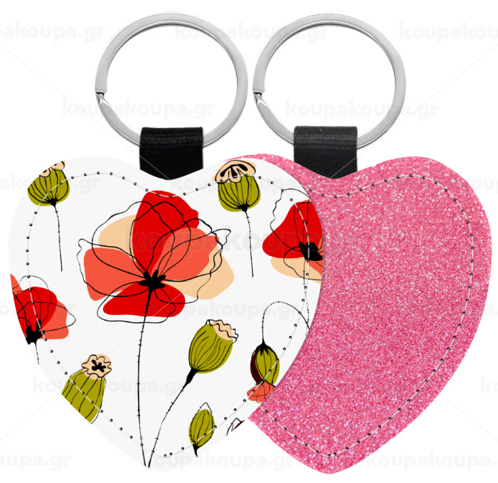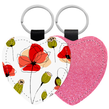 Red poppy flowers papaver, Μπρελόκ PU δερμάτινο glitter καρδιά ΡΟΖ