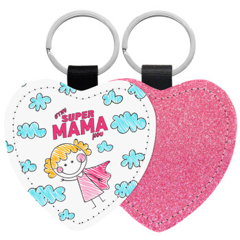 Στην SUPER μαμά μου, comic, Μπρελόκ PU δερμάτινο glitter καρδιά ΡΟΖ