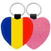 Romania flag, Μπρελόκ PU δερμάτινο glitter καρδιά ΡΟΖ