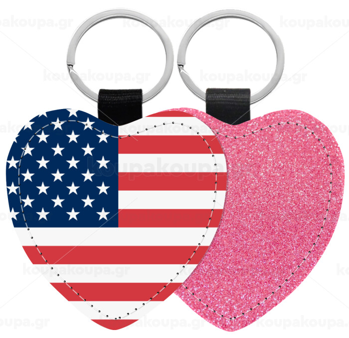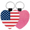 USA flag, Μπρελόκ PU δερμάτινο glitter καρδιά ΡΟΖ