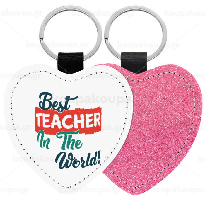 Best teacher in the World!, Μπρελόκ PU δερμάτινο glitter καρδιά ΡΟΖ