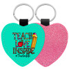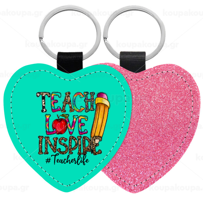 Teach, Love, Inspire, Μπρελόκ PU δερμάτινο glitter καρδιά ΡΟΖ